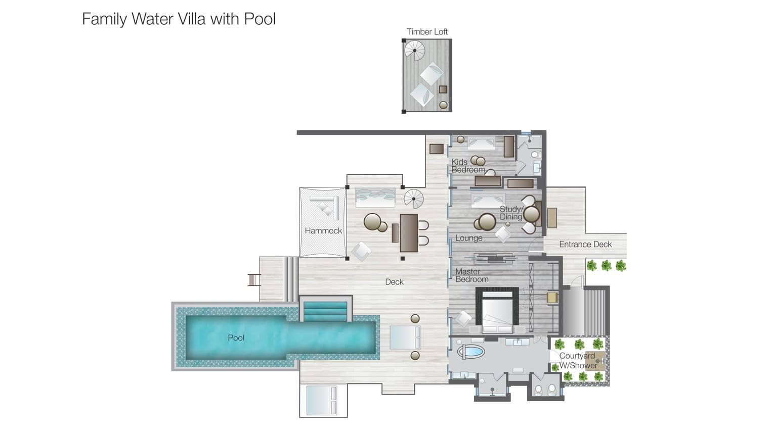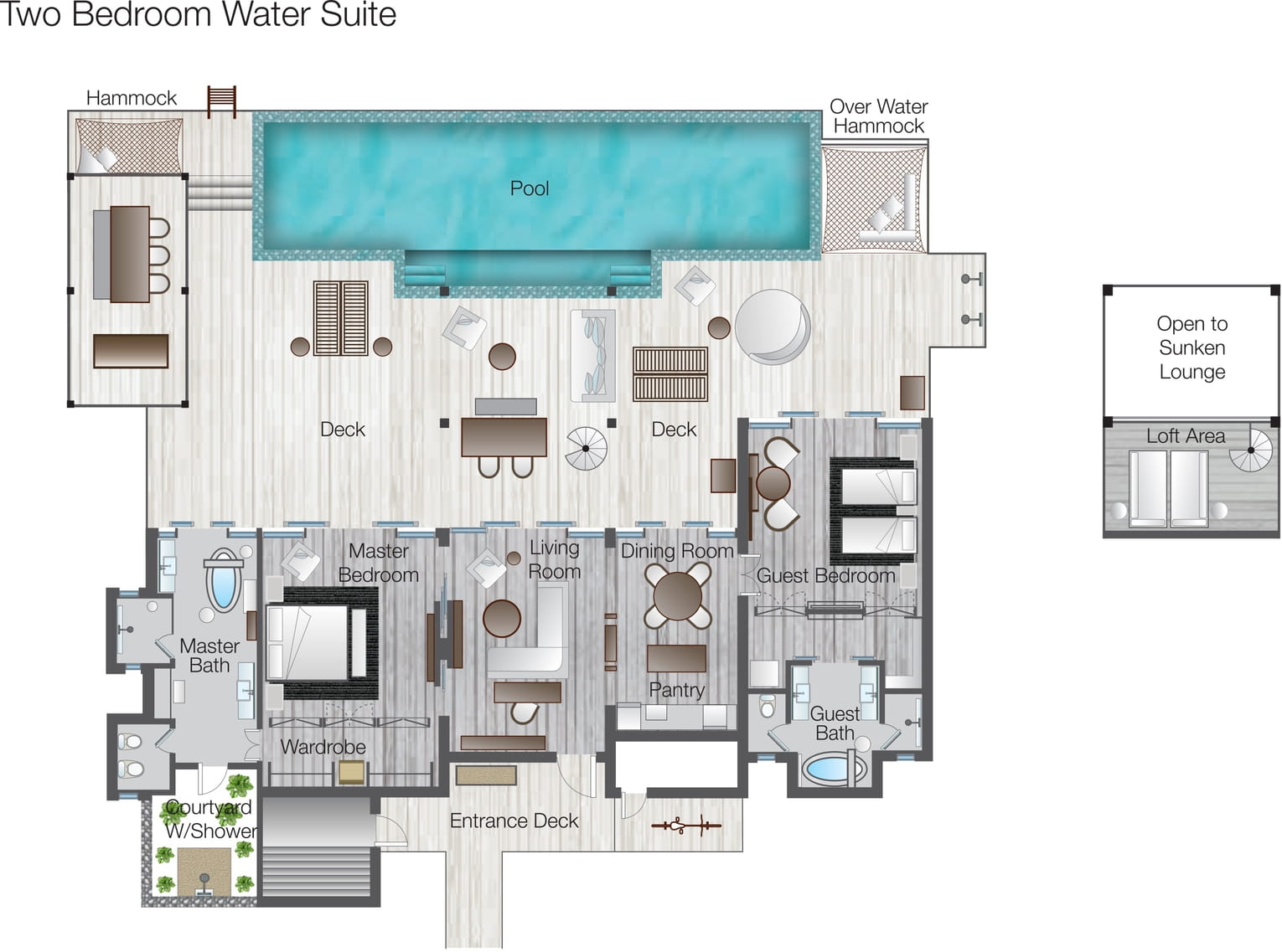 Площадь номера — 182 кв.м + 200 кв.м открытой площади. Виллы на воде с двумя спальнями и бассейном, с видом на закат или восход. Состоят из спальни с большой двуспальной кроватью с ванной комнатой с ванной, крытым и открытым душами; второй спальни с двумя раздельными кроватями и собственной ванной комнатой; гостиной и столовой; просторной террасы с бассейном, обеденной и дневной зонами, лежаками, гамаком и спуском в воду.