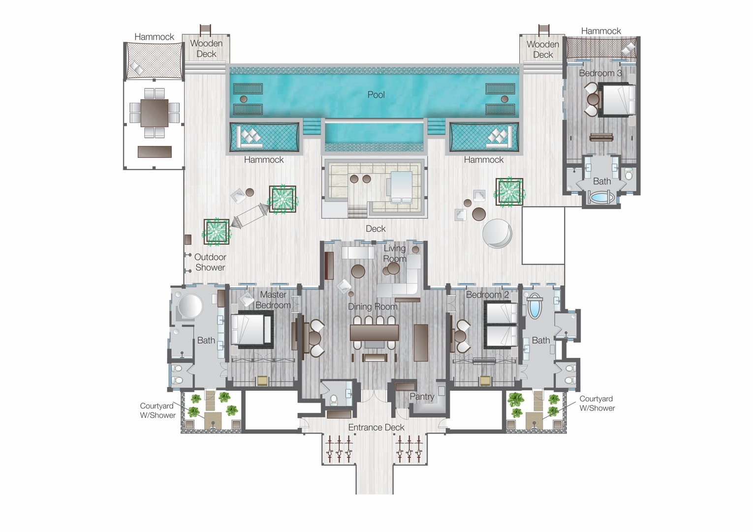 Площадь номера — 77 кв.м + 91 кв.м открытого пространства. Бунгало с бассейном на берегу океана в северной части острова. Состоят из спальни с большой двуспальной кроватью или двумя односпальными кроватями; зоны отдыха с диваном-кроватью; гардеробной; ванной комнаты с ванной, крытым и открытым душами; террасы с бассейном, обеденным павильоном, лежаками, гамаком и выходом на пляж.