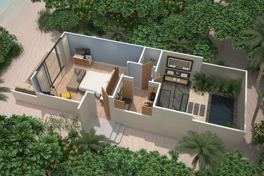 Площадь номера — 280 кв.м. Береговые виллы с бассейном. Состоят из трёх спален с большими двуспальными кроватями (каждая с ванной комнатой), гостиной со столовой зоной, террасы с зоной отдыха, обеденной зоной и бассейном на пляже.